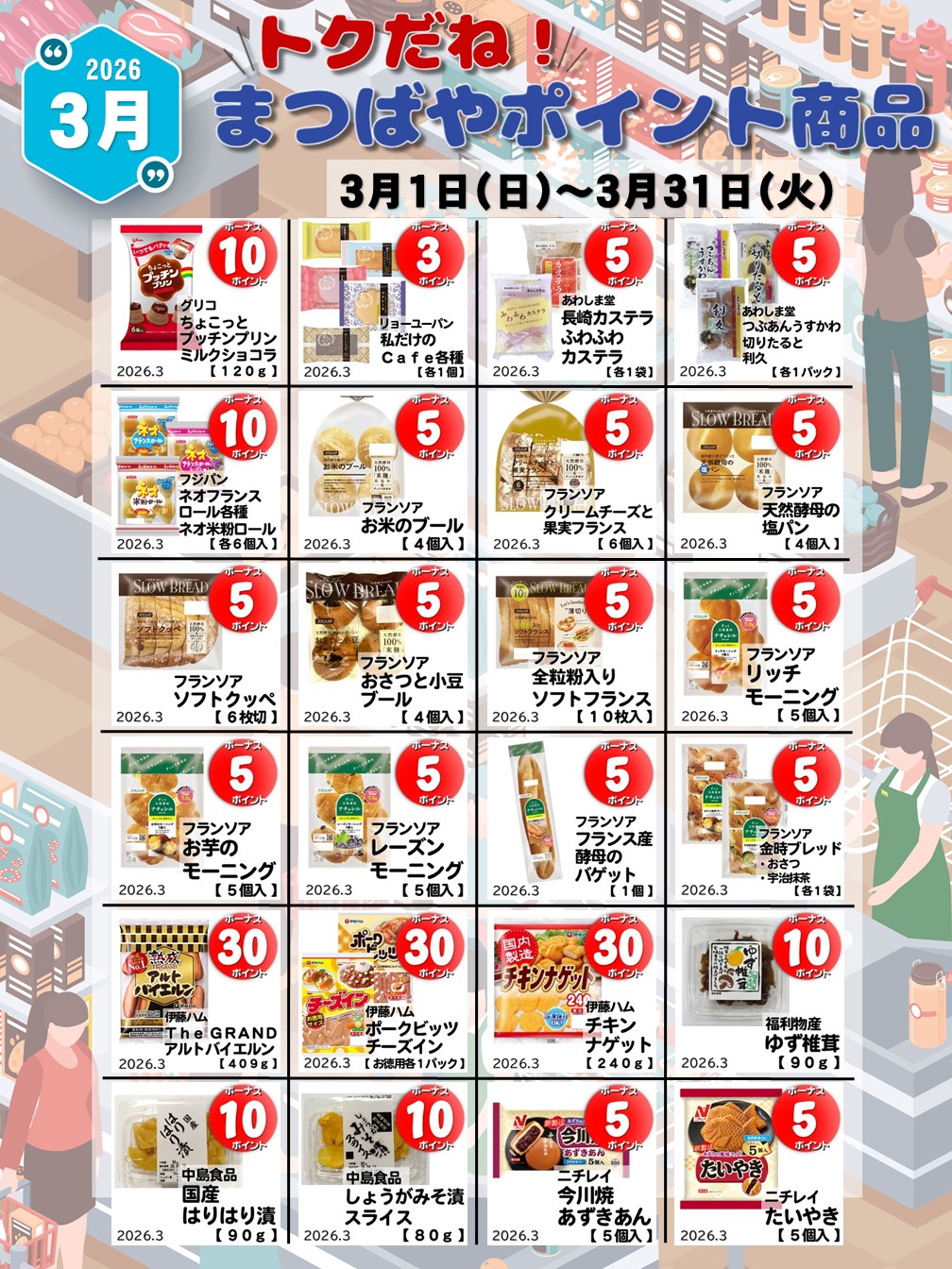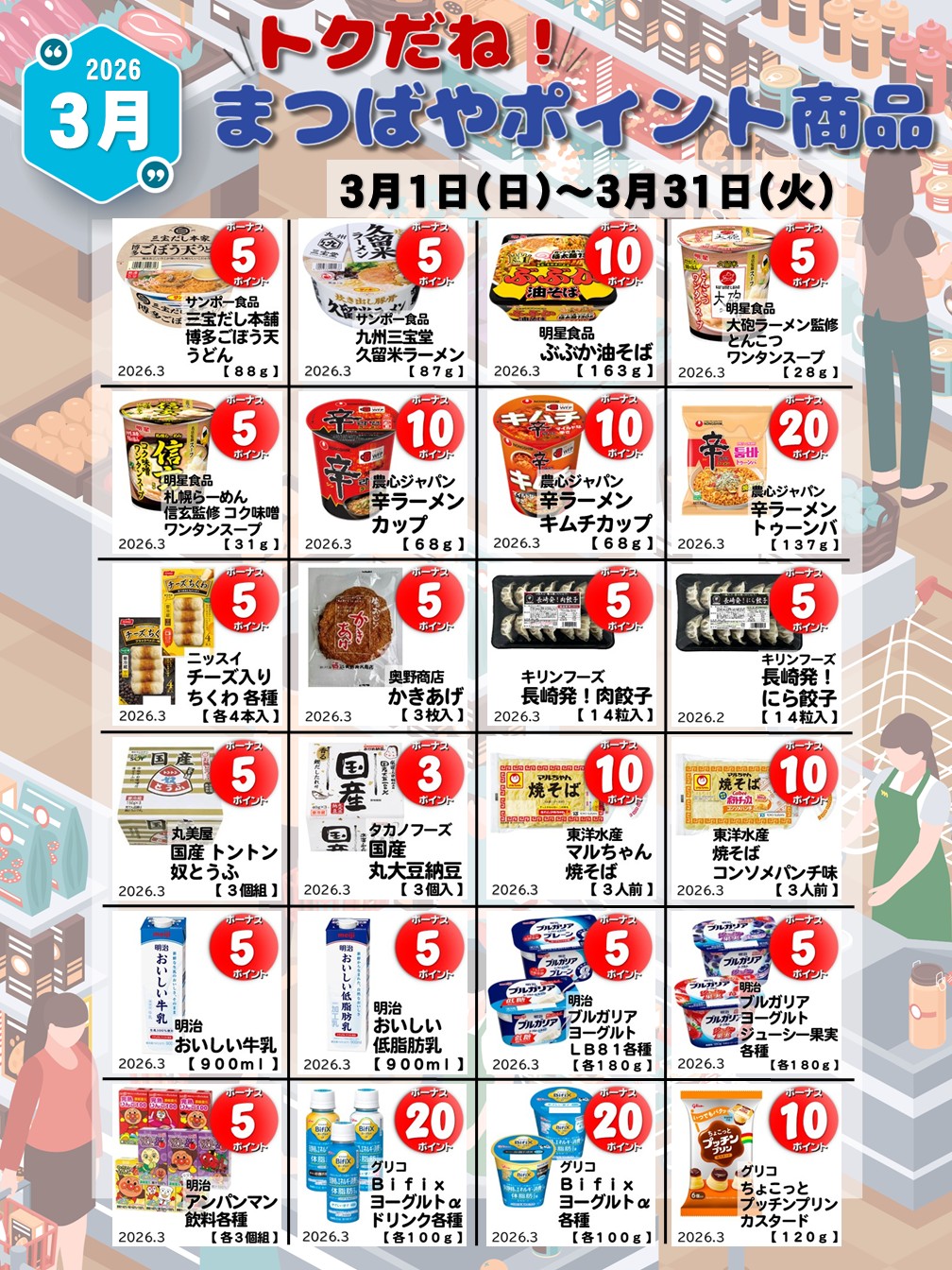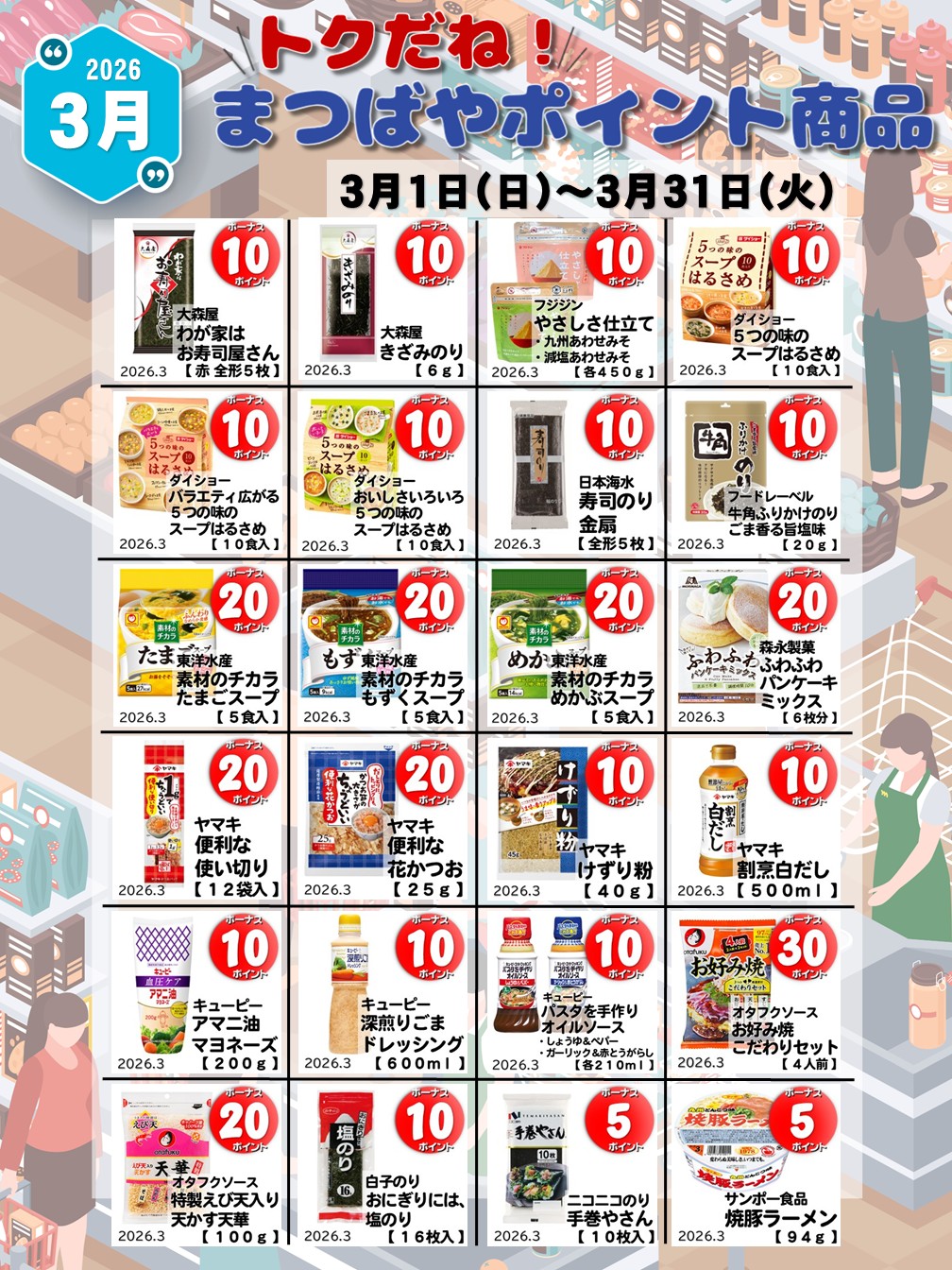 2026年3月のボーナスポイント商品!まつばやエムポイントがお得に貯まる!対象商品をお買上げでボーナスポイントを進呈!ボーナスポイント商品には、プレゼントされるポイント数が表示されています。商品によってポイント数が異なりますので、ご確認のうえご購入ください。※ボーナスポイント企画は他のポイント倍付企画と併用できません。