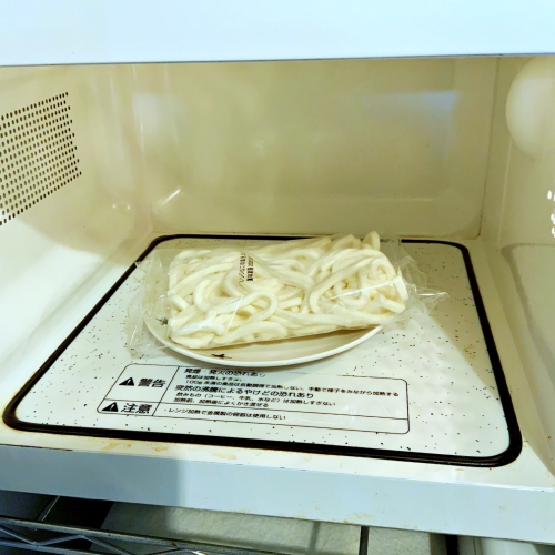 ③ 冷凍うどんを袋のままレンジ(500W)で4分温めます。