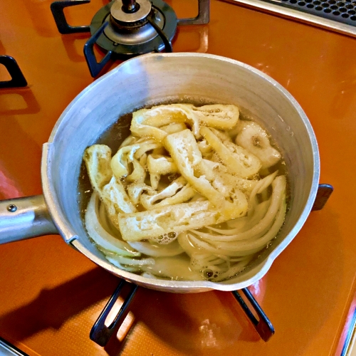 ④ ②に玉ねぎとうすあげを入れ、一煮立ちさせます。