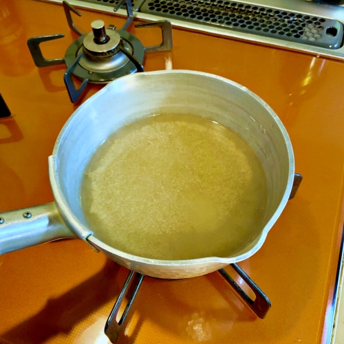 ② 小鍋に水とほんだしを入れ沸騰させます。