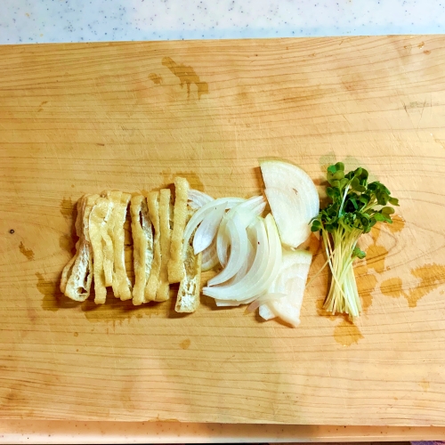 ① 玉ねぎを薄切りに、うすあげを短冊切り、かいわれの根本を