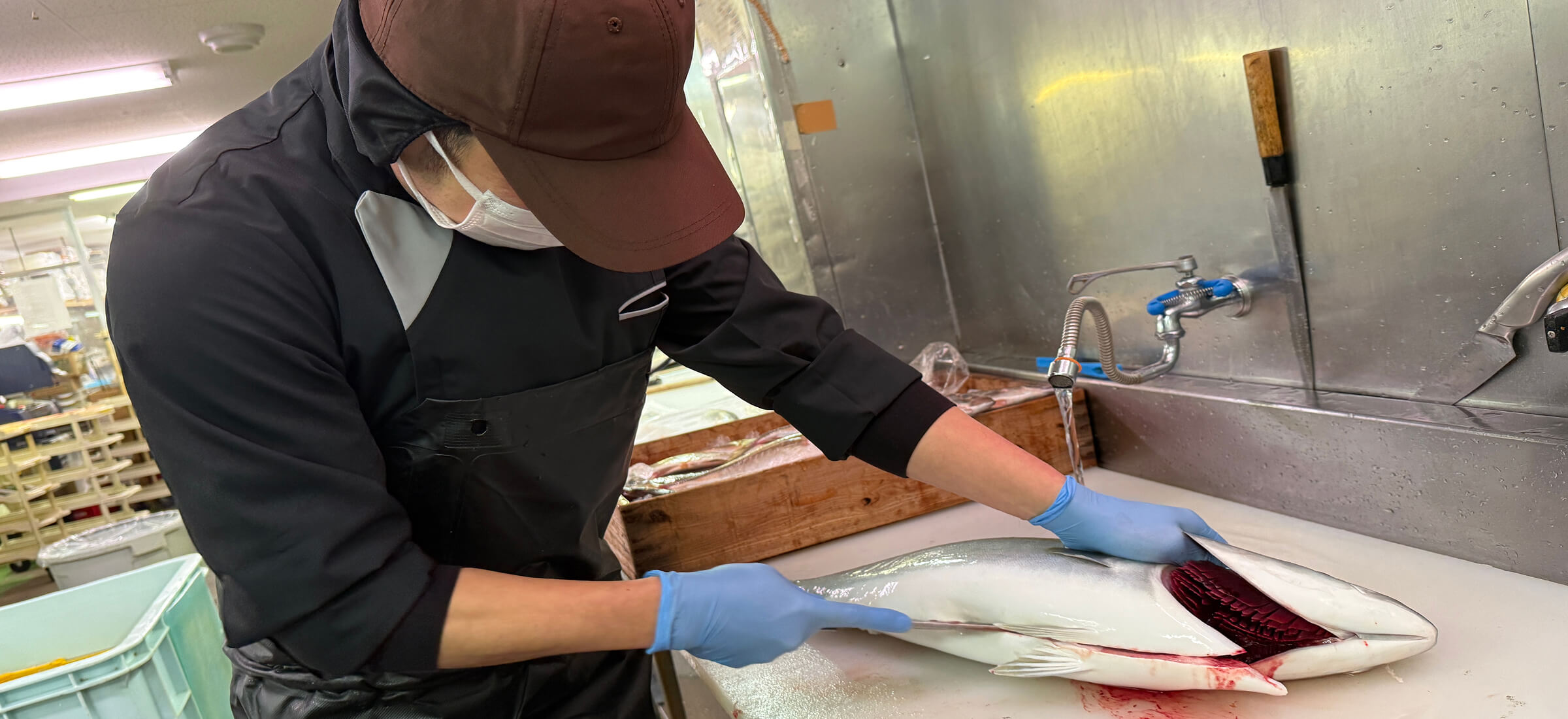 魚の“目”と“エラ”です。目の澄み具合、エラの色味、身の張り。妥協のない見極めがまつばや品質の始まりです。
