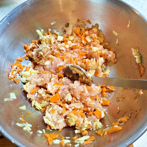 材料の切れ端や形の崩れたもの、しいたけの軸などをみじん切りにして、鶏ひき肉とつみれの下味用材料を入れ 練ります。