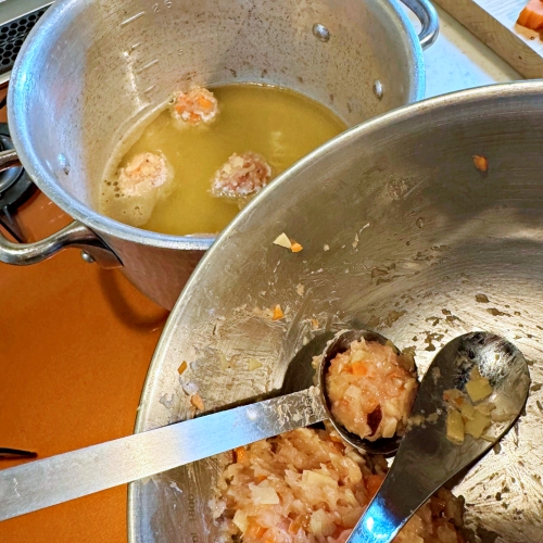 鍋にだし汁を沸かしたら、④をスプーンなどで丸くして 入れます。