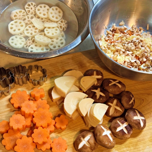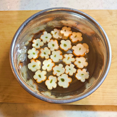 れんこんは水に浸して、にんじんはお花の型抜きで抜きます。