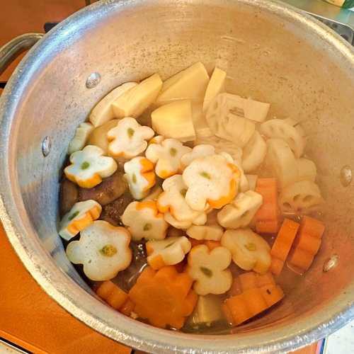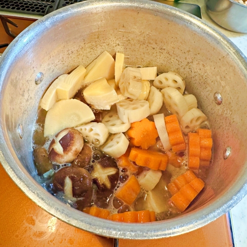 崩れないように混ぜたら、煮物用の調味料を入れ蓋をしてさらに10分煮ます。