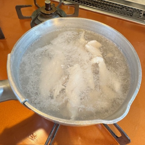 ささみの筋を取り除き、鍋に水(分量外)を沸かせて2分ほど茹でます。
