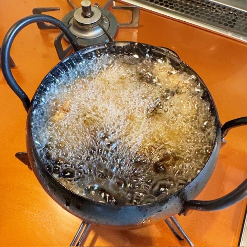油を熱し180℃で3分程度、外側がきつね色になるまで揚げたら出来上がり♪