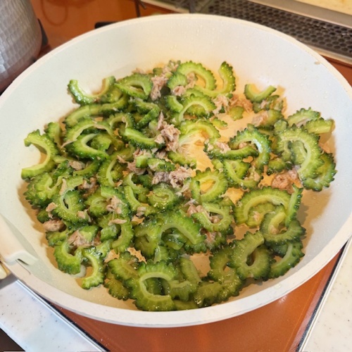 ②を一度流水で洗い、水気を切ったら④に入れ焼きます。ゴーヤに火が通ったらツナを入れます。