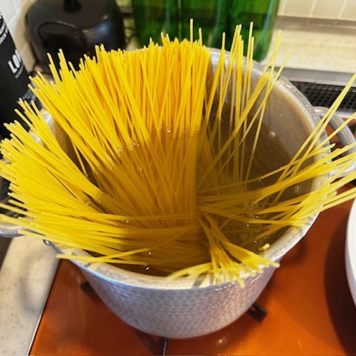 鍋にたっぷりのお湯を沸かし、パスタを茹でます。(入れる塩や茹でる時間は袋の記載通りに茹でてね♪)