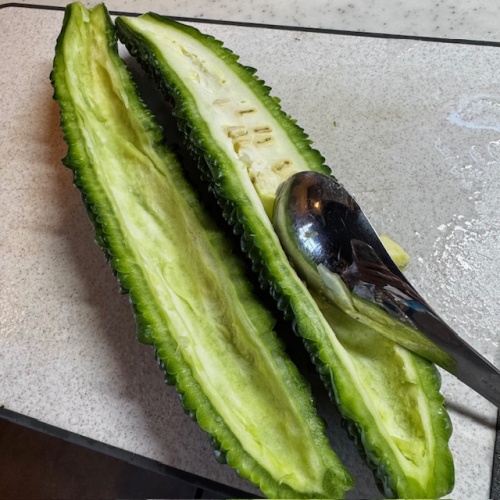 ゴーヤを洗ったら縦半分に切り、ワタをスプーンでくり抜きます。