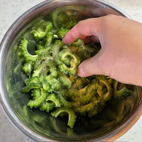 幅3ミリほどにカットしたらボウルに入れ、塩と砂糖を入れて混ぜます。5分以上置いておきます。