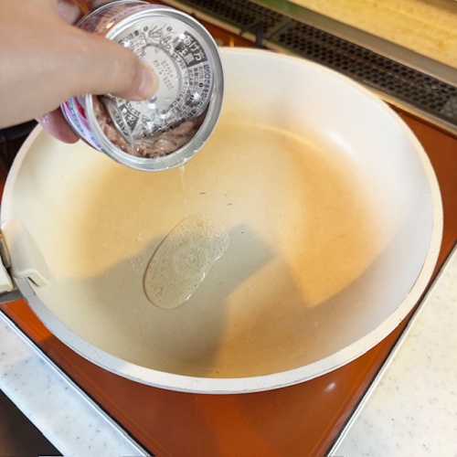 フライパンを熱したら、ツナ缶のオイル、オリーブオイルを入れます。