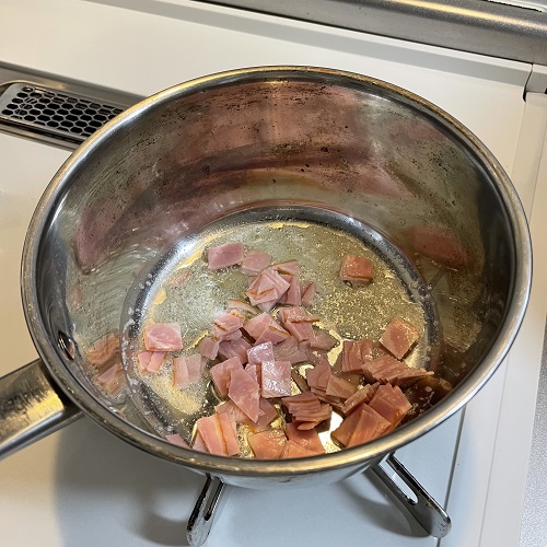 鍋に火を付けバターを入れたらベーコンを炒めます。