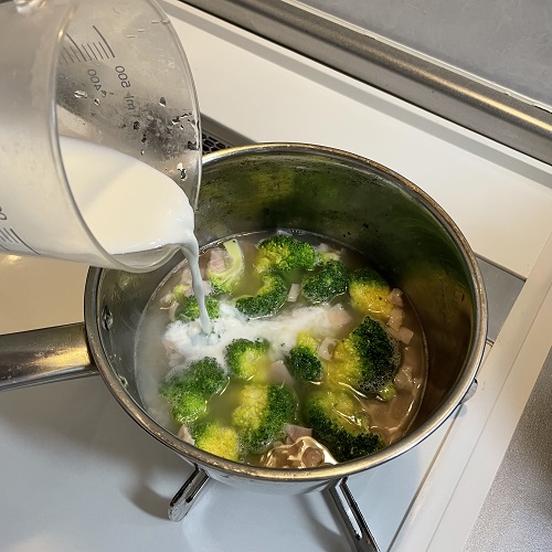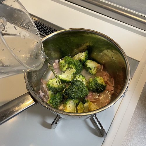 ブロッコリーを入れ全体を混ぜ合わせたら水を入れます。