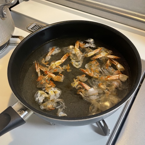 エビをよく洗い殻を剝き背わたを取ったら、殻をフライパンで乾煎りします。