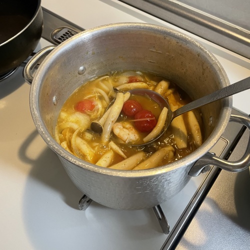 火をつけエビ、たまねぎ、ミニトマト、しめじを入れて10分程煮立たせます。
