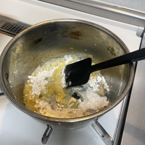 牛乳を5回程に分けて入れていきます。都度よく混ぜながらとろみがついたら次を入れる感じです。