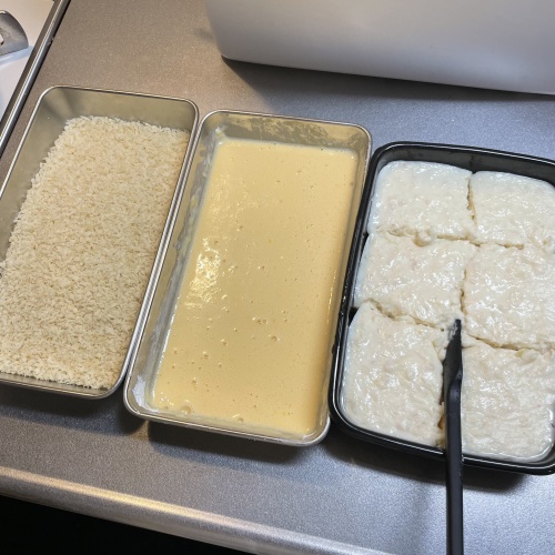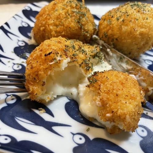 食べやすいサイズに⑤を丸めバッター液、パン粉を付けます。パン粉はまんべんなく綺麗に付けるのがコツ♪