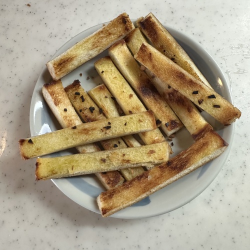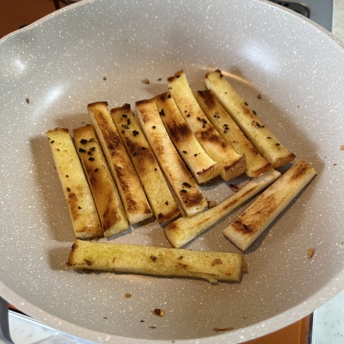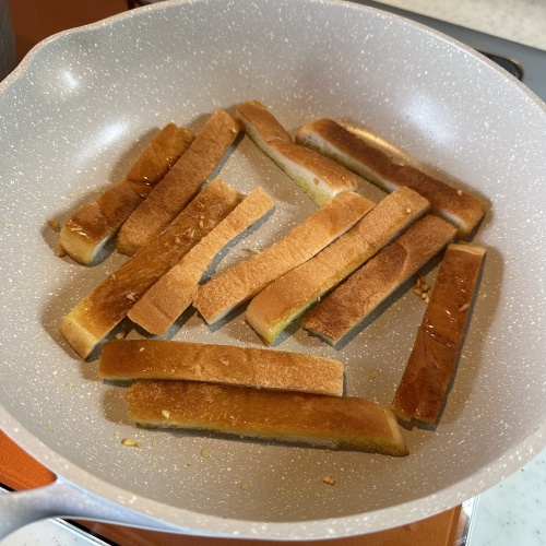 にんにくに少し色が付いてきたらパンの耳の白い方を下にして中火で焼きます。