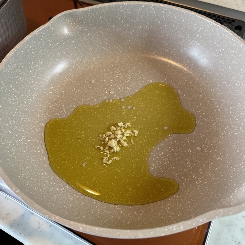 フライパンにオリーブオイルとみじん切りにしたにんにくを入れ弱火で熱します。