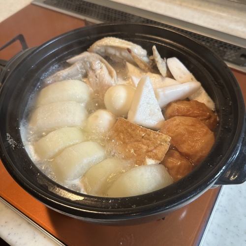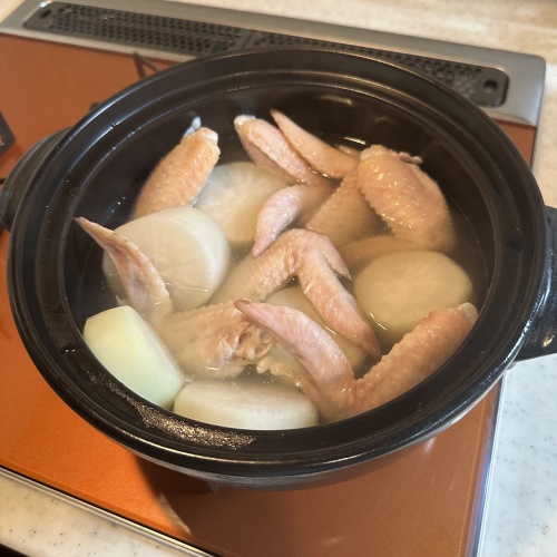 鍋にだし汁を入れ沸騰したら、③の大根と手羽先を入れます。