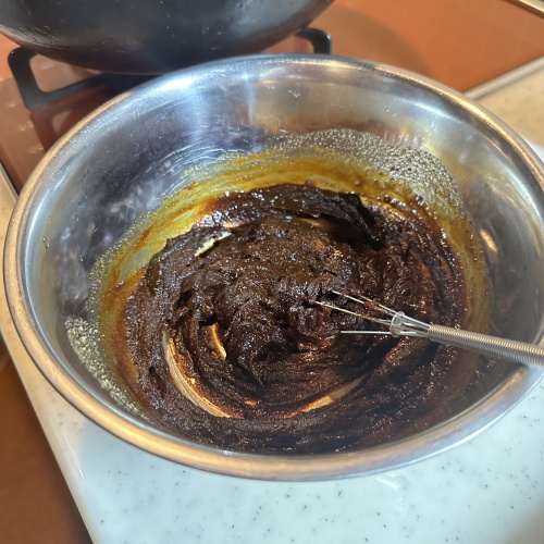 ボウルに八丁味噌、酒、砂糖、みりんを入れ、混ぜます。