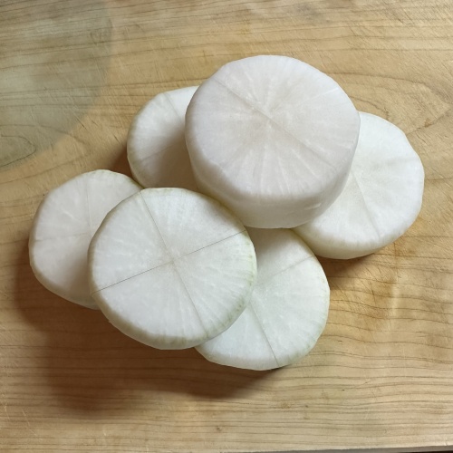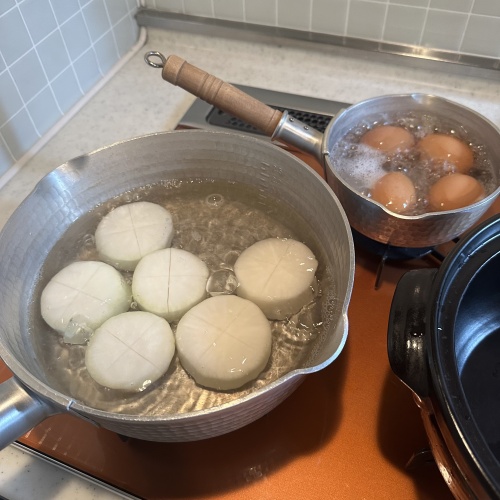 大根を下茹で、卵を茹でます。(どちらも15分程。)