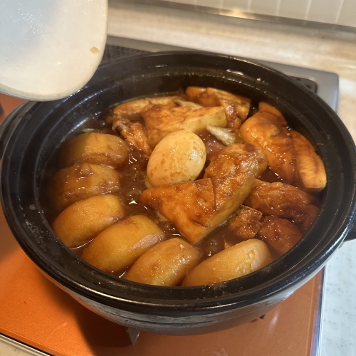 殻を剥いた卵と残りの具材を入れ、煮立てます。