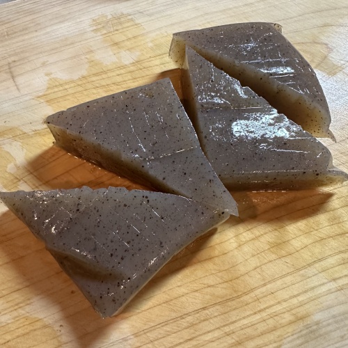 こんにゃくを塩を擦り込み水で洗ったら、表面に格子状の隠し包丁を入れ、三角にカットします。