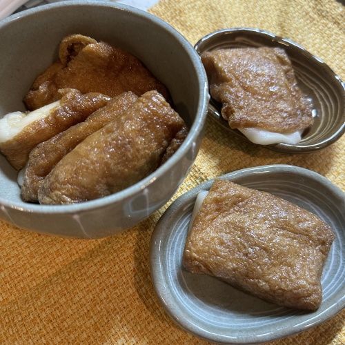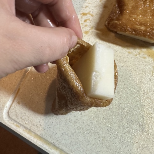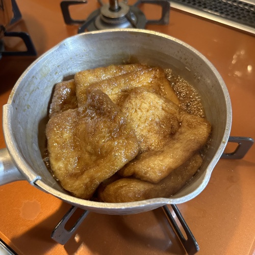 鍋にお湯を沸かし、すしあげを入れて油抜きしたらザルにあげお湯を切ります。