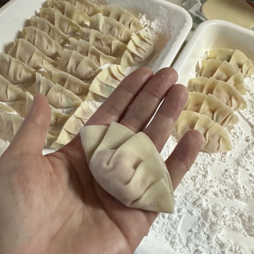 バットに片栗粉を振り、餃子の皮1枚に小さじ1程度の④を入れ、包みます。