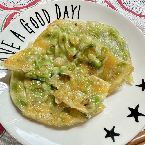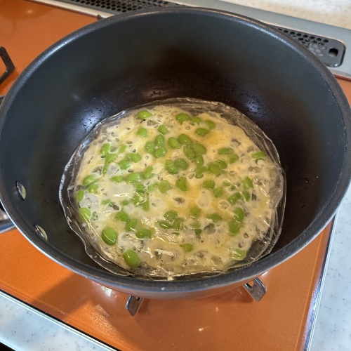 フライパン(くっつくようであれば少し油を引いてね)に水にさっと潜らせたライスペーパー、枝豆、チーズを乗せ中火にかけます。