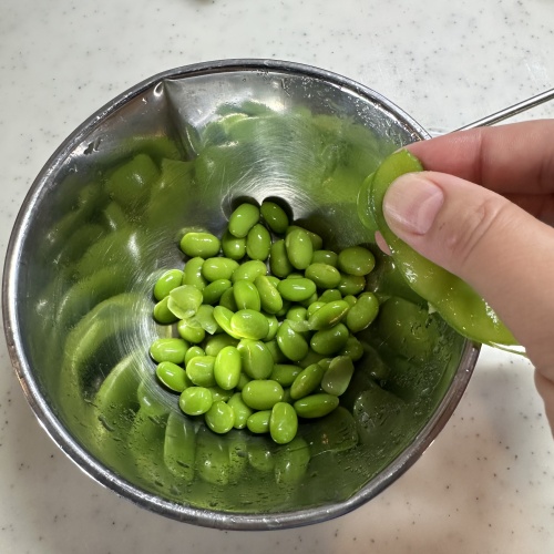 冷凍枝豆を流水で解凍し皮を剥きます。