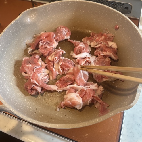 フライパンを熱したらごま油を入れ、豚肉を炒めます。