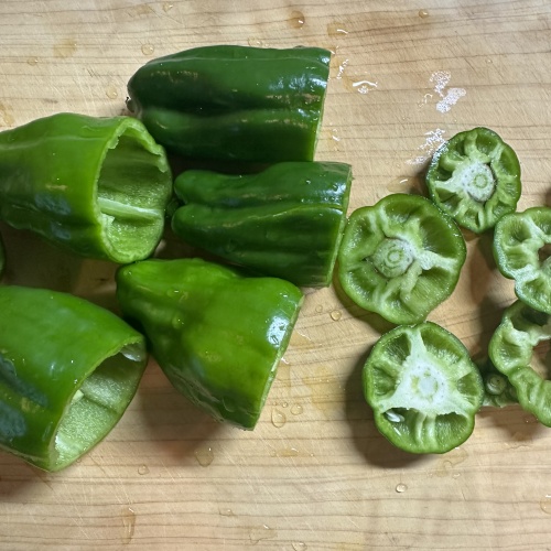 ピーマンを洗ったらヘタと種を取り除きます。