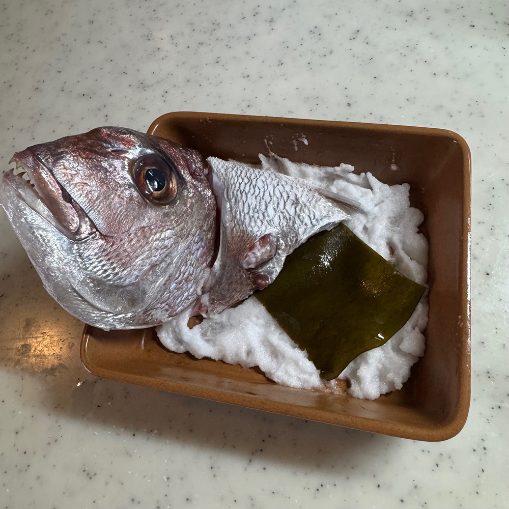 塩と卵白をよく混ぜ合わせて、お魚を隙間なくすっぽりと覆うのが、身をふっくらジューシーに仕上げる最大のコツです。塩のドームがオーブンの役割を果たし、昆布の旨みと鯛の水分を逃さずギュッと閉じ込めてくれます。もし表面の塩が焦げすぎる場合は、途中でアルミホイルをフワッと被せると綺麗に仕上がりますよ。