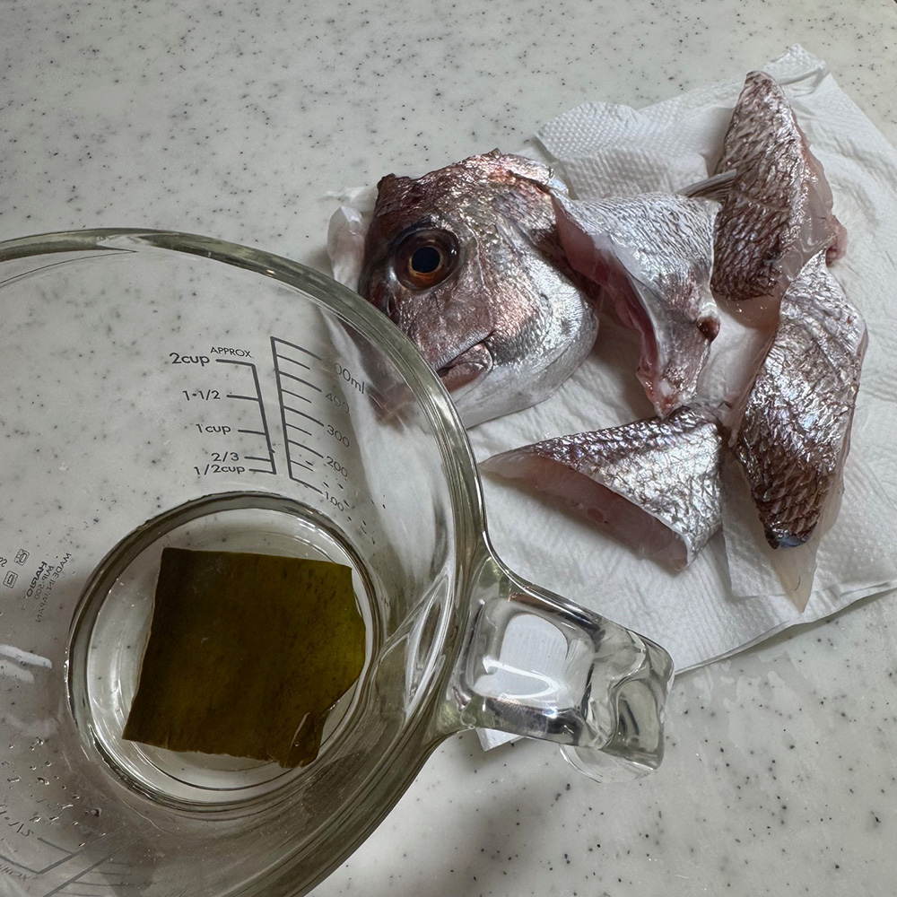鯛をよく洗い鱗があれば取り除きます。昆布はお水で戻してね。